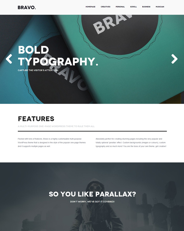 Packed with tons of features, Bravo is a highly customizable multi-purpose WordPress theme that is designed in the style of the popular one page WordPress themes ánd it supports multiple pages as well. Absolutely perfect for creating stunning pages including the very popular and totally optional ‘parallax’ effect.